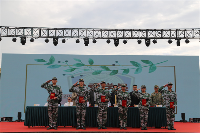 徐伟副校长宣读军训表彰决定。对军训中同学们的出色表现给予了充分肯定。校领导分别为军训先进集体、军训优秀学员和军训优秀指导员颁奖。