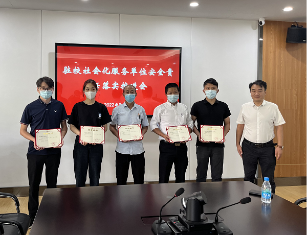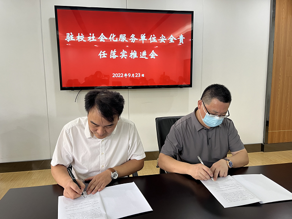 胡鹏远处长与各社会化服务单位负责人签订《综合治理暨安全生产责任书》并作工作布置。他指出,在学校创建高质量平安校园之际,所有驻校社会化服务单位要高度重视校园安全工作,以最严格的标准、最严实的措施,做好疫情防控、食品安全、燃气安全、施工安全等工作。他要求,各驻校社会化服务单位要落实责任追究,安全责任再压实;要强化监督问责,监督检查再跟进;要落实隐患排查,问题整改再落实;要落实保障举措,长效机制再探索;要重视安全教育,安全意识再提升。他强调,学校所有社会化服务单位都要高度重视,深刻认识校园安全生产重要性,不断提高政治站位,牢牢树立安全发展理念,进一步巩固和提升安全生产工作水平,以“零事故”、“优服务”迎接党的二十大胜利召开!